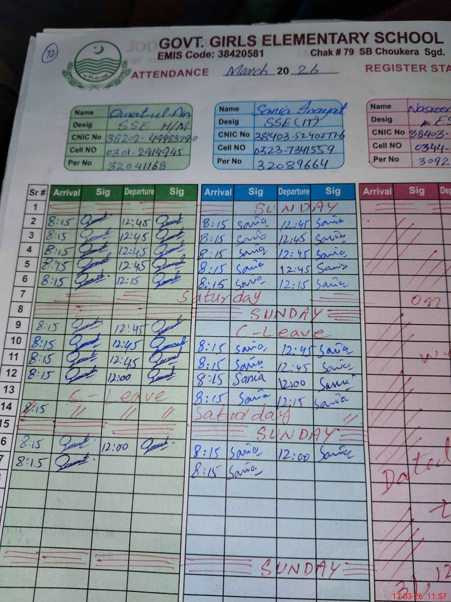 | CNIC | Full Name | Designation | R/C | Absence During Last Calender Month |