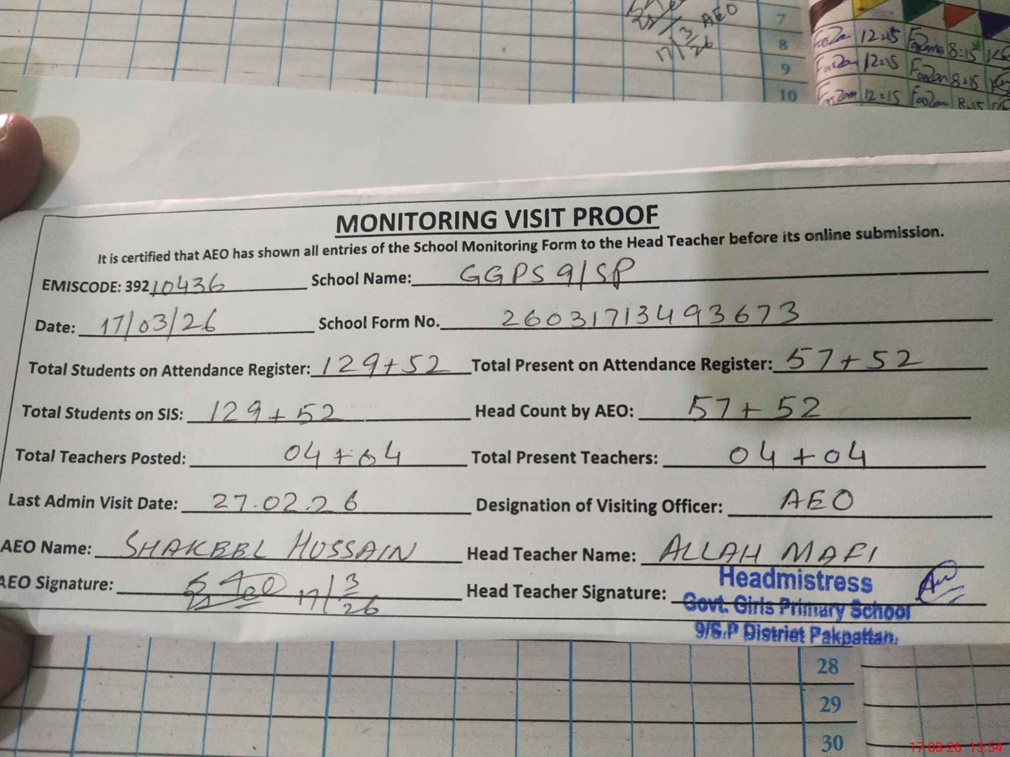 | Attendance Register | Head Teacher | MEA with School | Visit Proof |