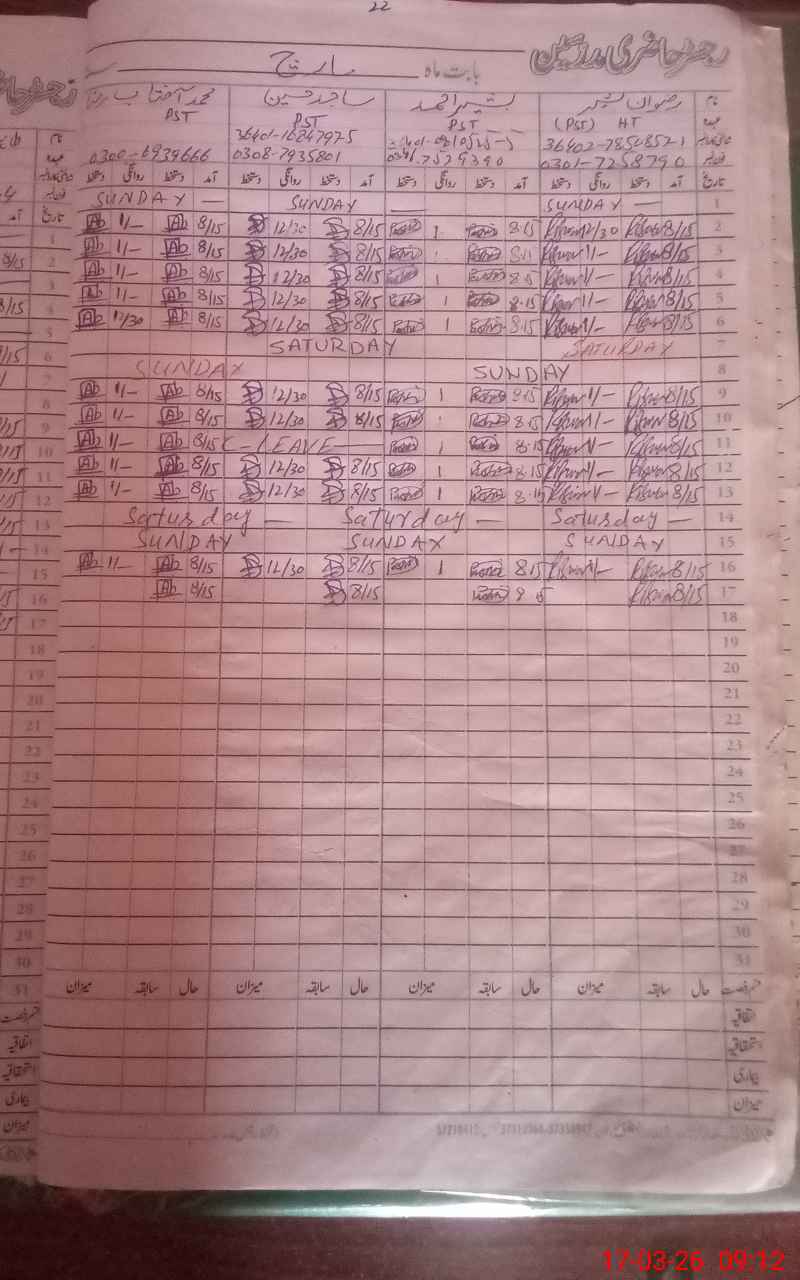 | CNIC | Full Name | Designation | R/C | Absence During Last Calender Month |