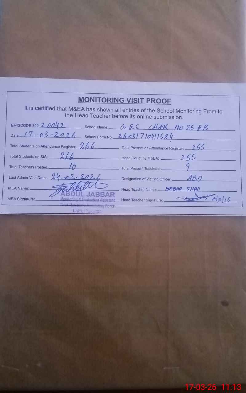 | EMIS Code: 39220042 | Name of School: GES CHAK NO. 25 / EB | |||