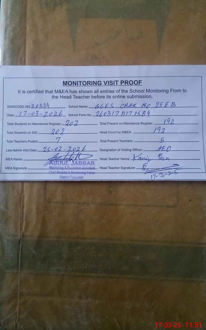 | EMIS Code: 39220334 | Name of School: GGES CHAK NO 25 EB | |||