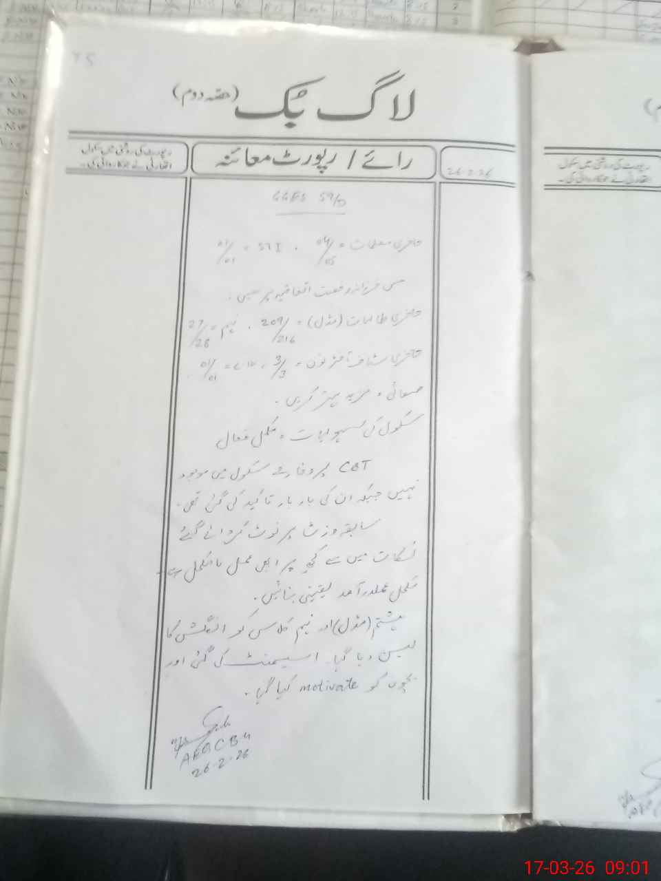 | Remarks (Use Separate Page if Required): sti Saba musharaf present in this school narsary class off class three not SBA class one two four five six seven and eight progress SBA at school books record D 4 not showing | |||||