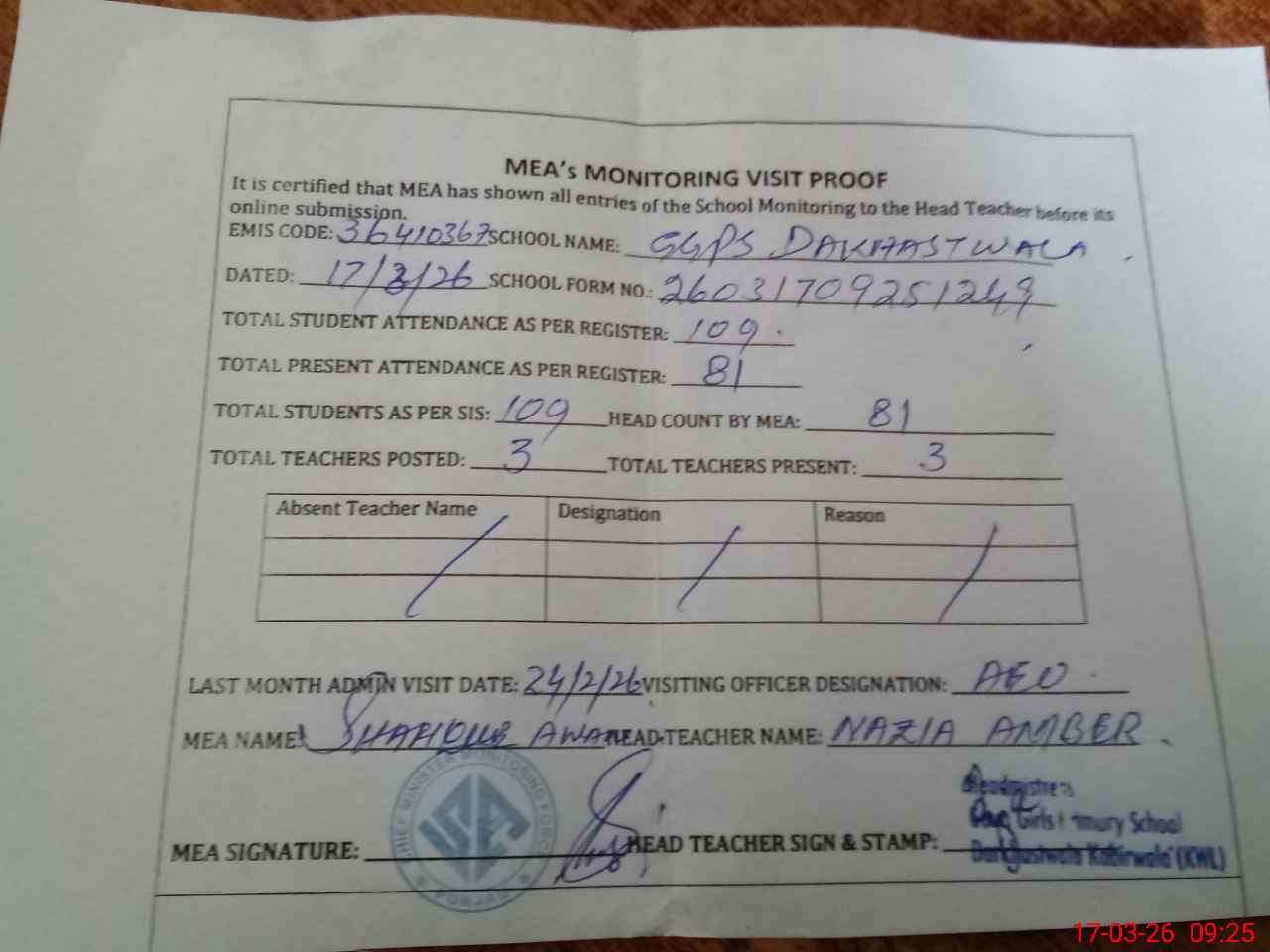 | Attendance Register | Head Teacher | MEA with School | Visit Proof |
