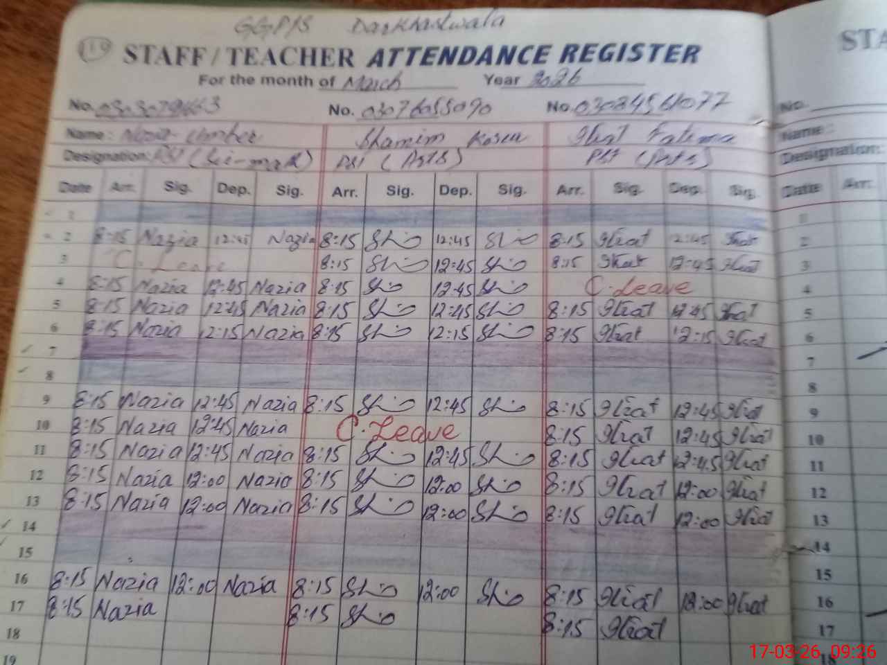 | CNIC | Full Name | Designation | R/C | Absence During Last Calender Month |