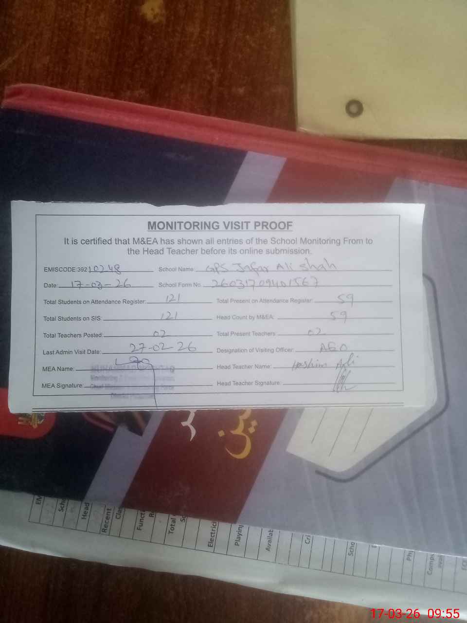 | Attendance Register | Head Teacher | MEA with School | Visit Proof |