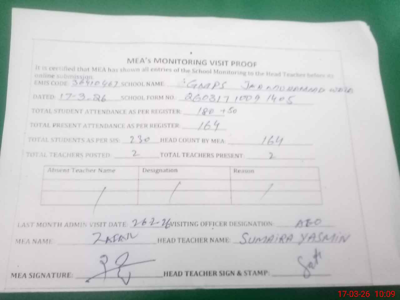 | Attendance Register | Head Teacher | MEA with School | Visit Proof |