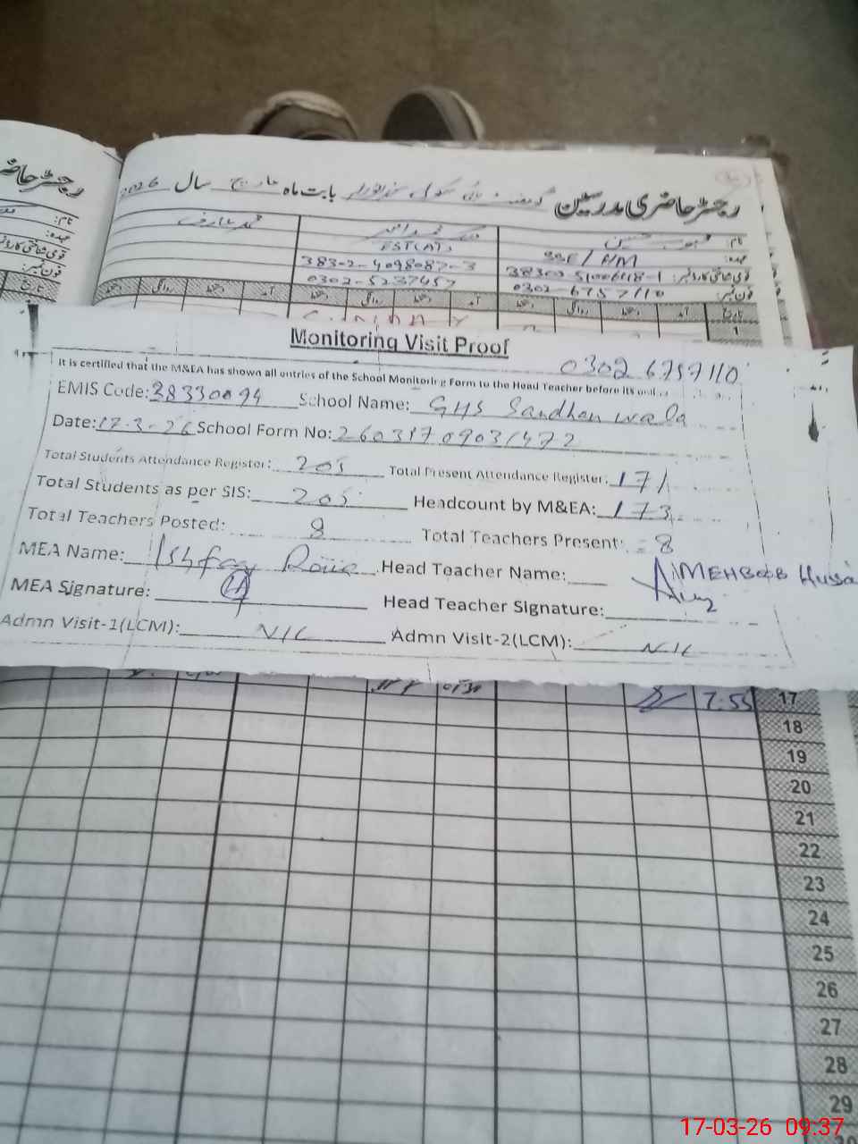 | Attendance Register | Head Teacher | MEA with School | Visit Proof |