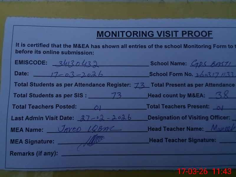 | EMIS Code: 34130432 | Name of School: GPS BASTI BAHAR SHAH | |||