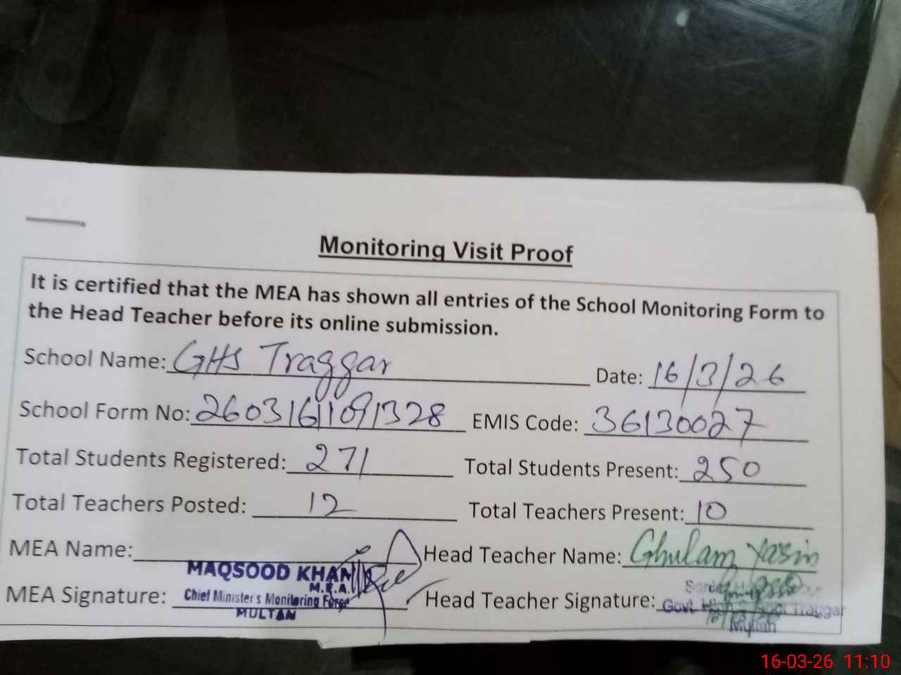 | EMIS Code: 36130027 | Name of School: GHS TRAGGAR MULTAN | |||