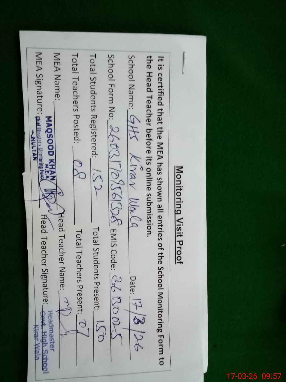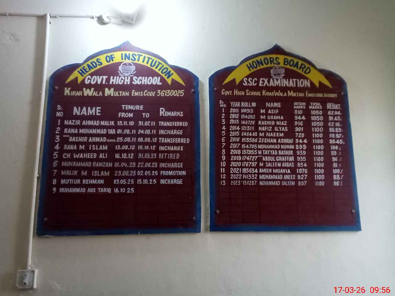 | EMIS Code: 36130025 | Name of School: GHS KIRAR WALA MULTAN | |||
