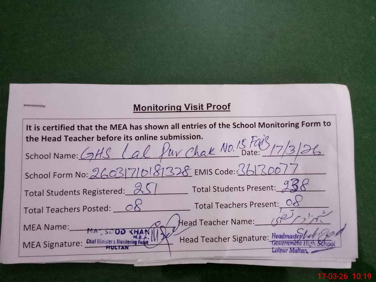 | EMIS Code: 36130077 | Name of School: GHS LAL PUR CHAK NO. 15 FAIZ | |||