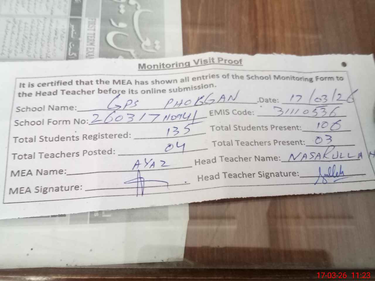 | Attendance Register | Head Teacher | MEA with School | Visit Proof |