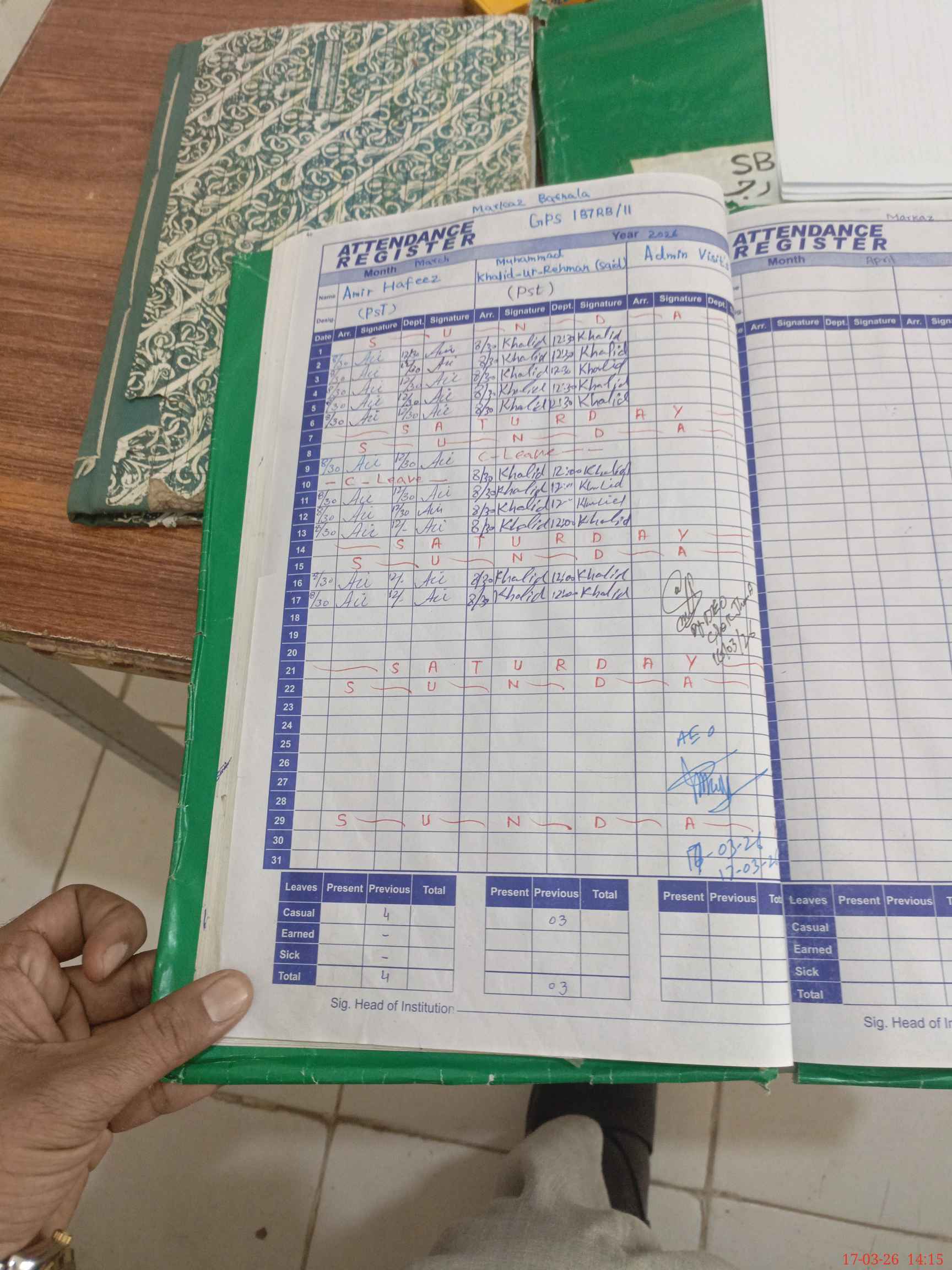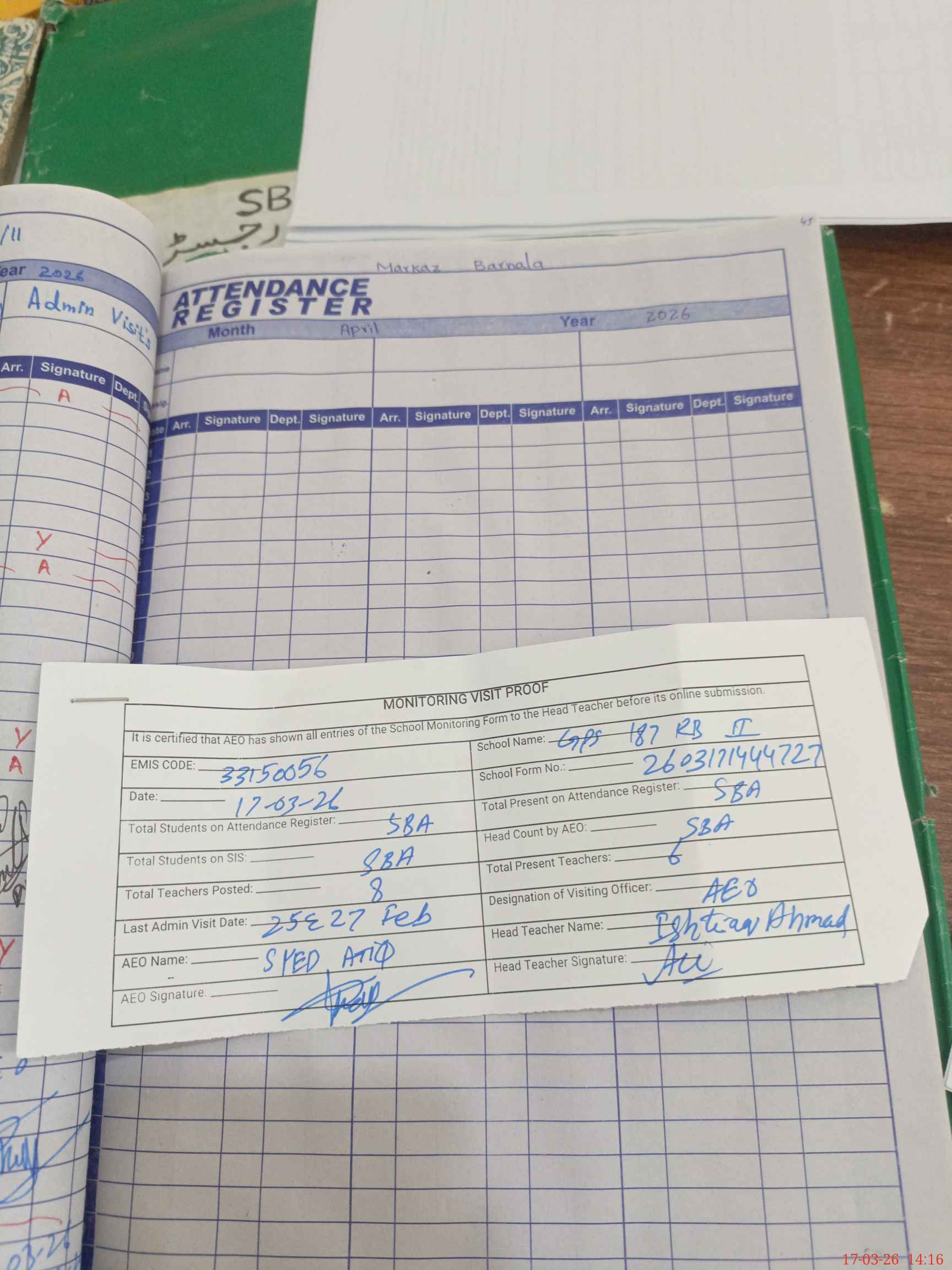 | Attendance Register | Head Teacher | MEA with School | Visit Proof |