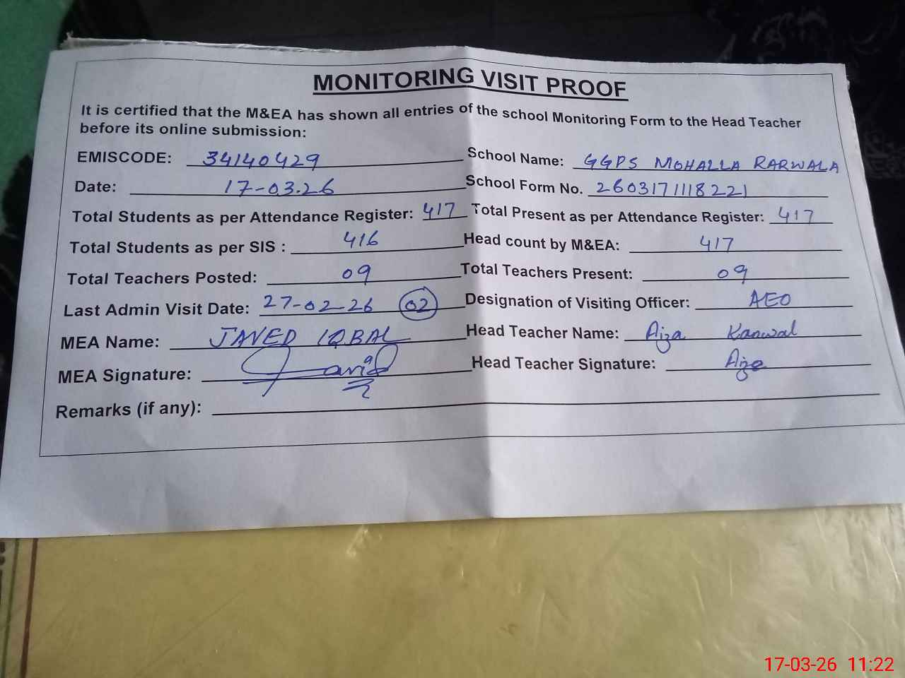 | Attendance Register | Head Teacher | MEA with School | Visit Proof |
