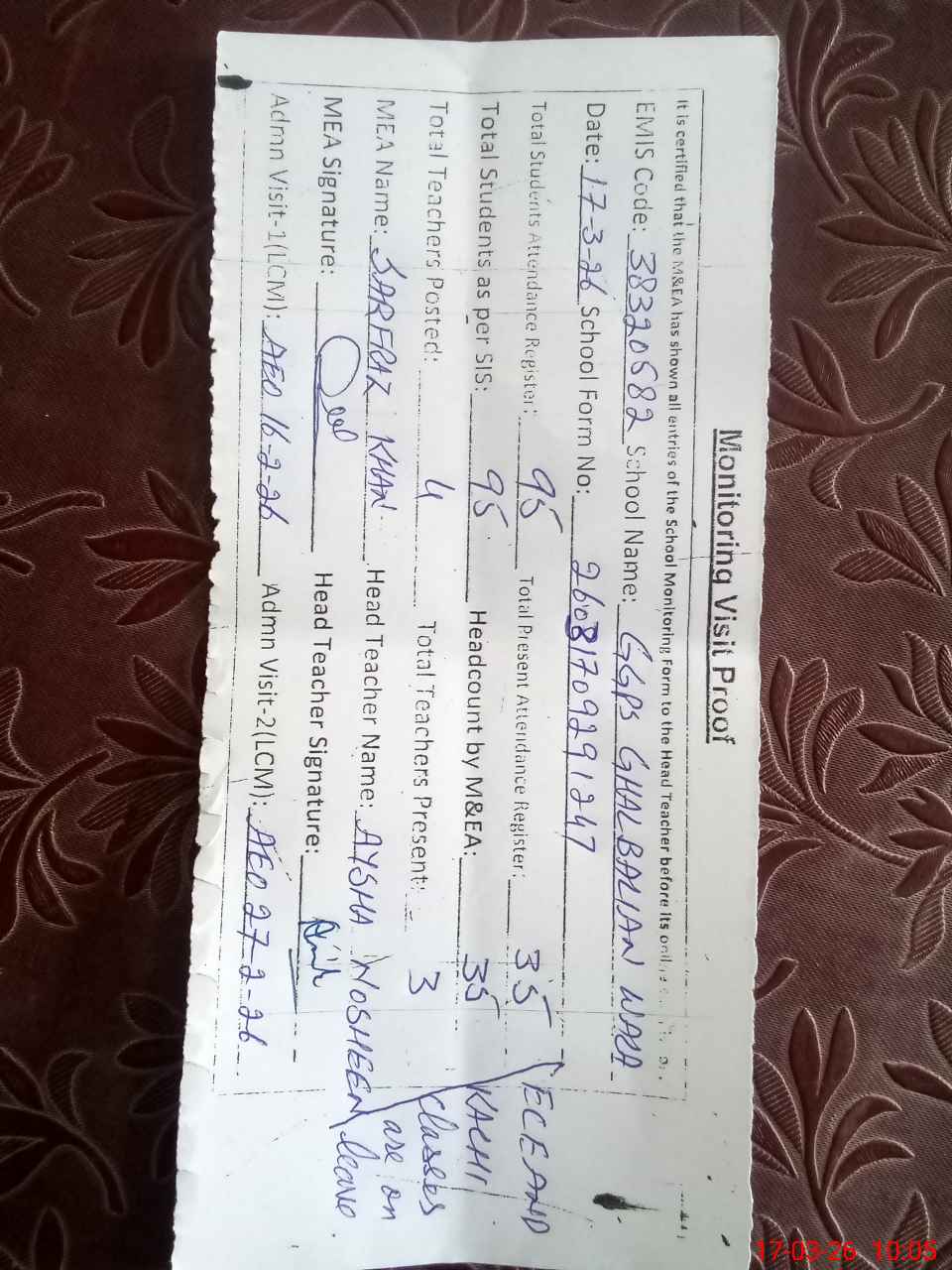 | EMIS Code: 38320582 | Name of School: GGPS GHAL BALIAN WALA | |||