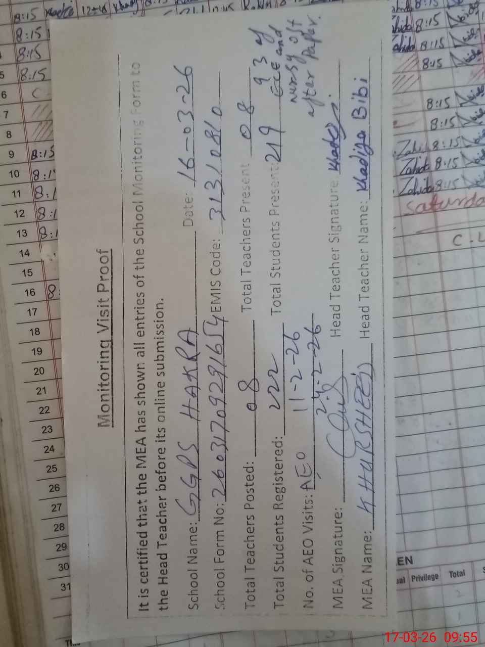 | Attendance Register | Head Teacher | MEA with School | Visit Proof |