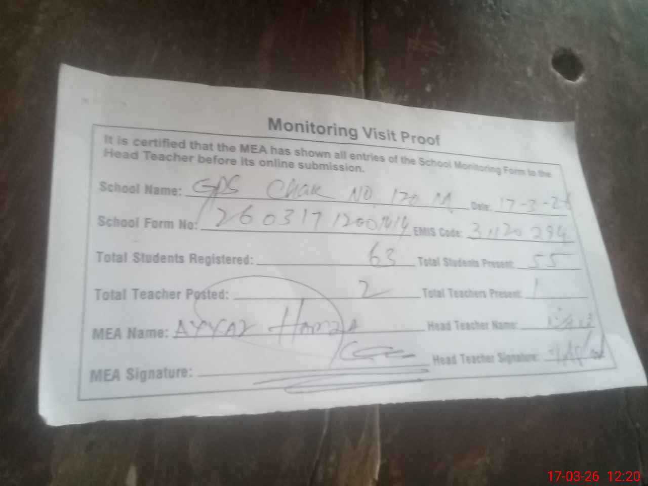 | Attendance Register | Head Teacher | MEA with School | Visit Proof |