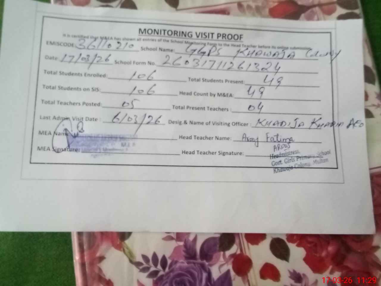 | Attendance Register | Head Teacher | MEA with School | Visit Proof |