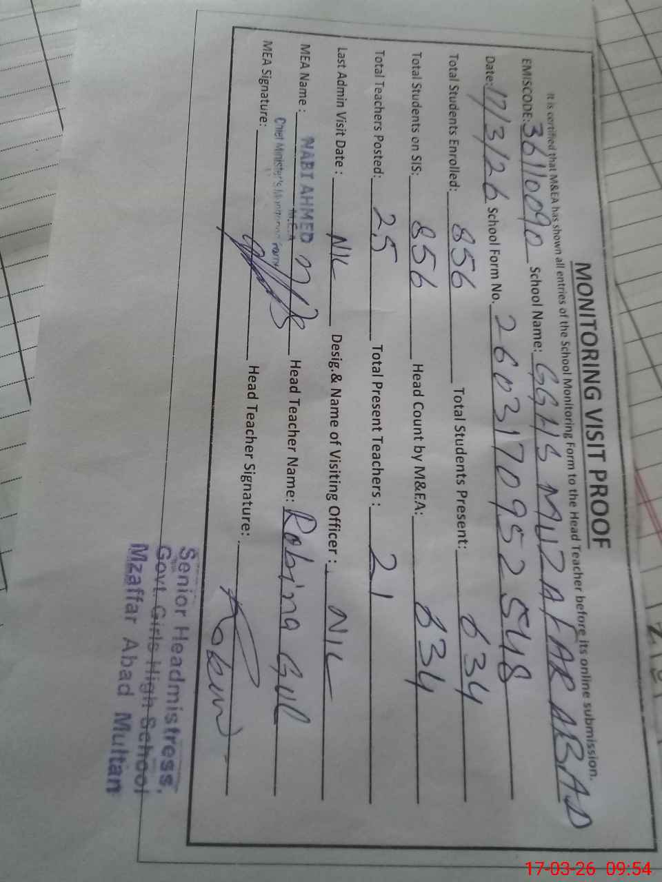 | EMIS Code: 36110090 | Name of School: GGHS MUZAFAR ABAD | |||