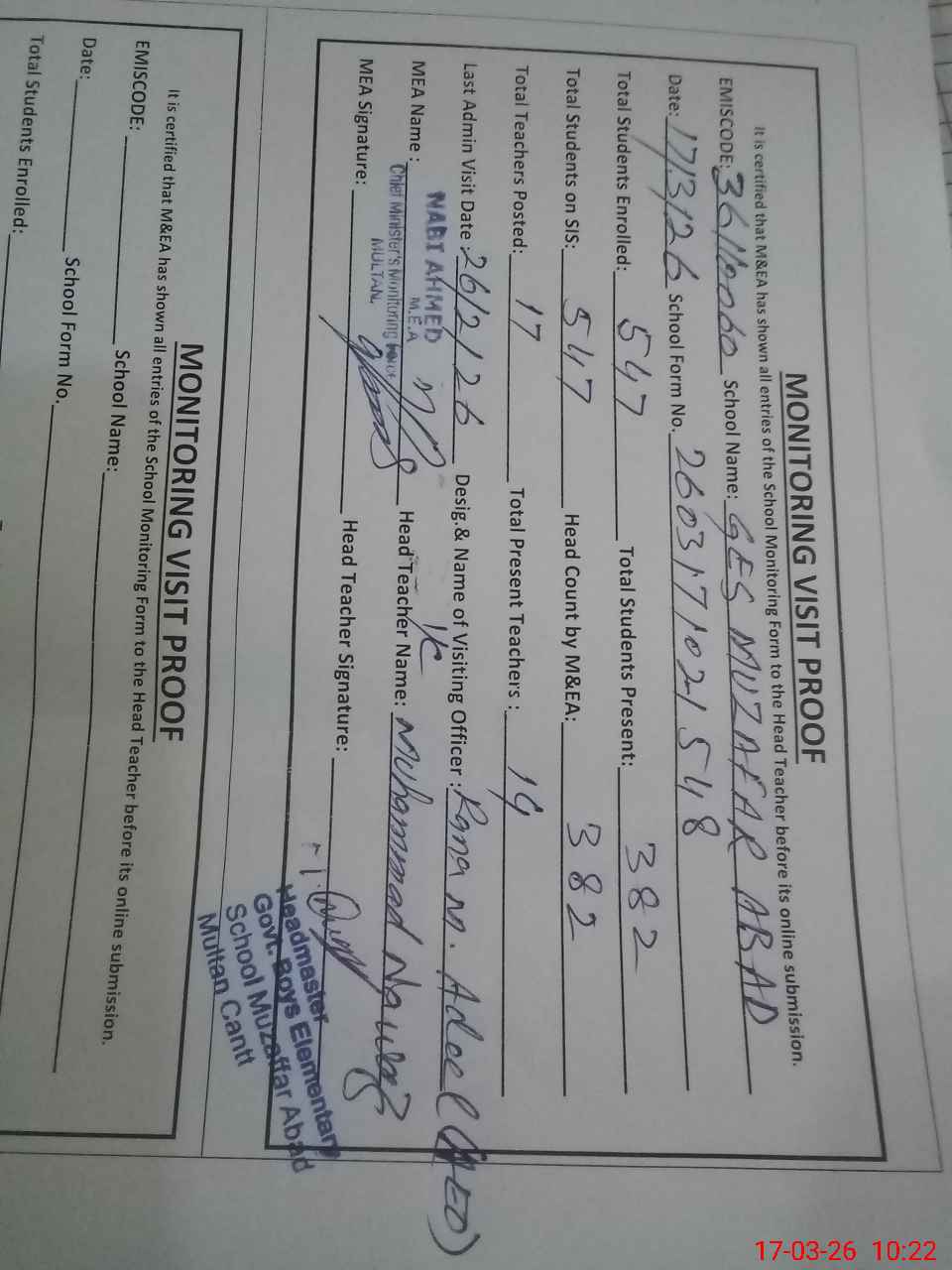 | EMIS Code: 36110060 | Name of School: GES MUZAFAR ABAD SHER SHAH ROAD MULTAN CANTT. | |||