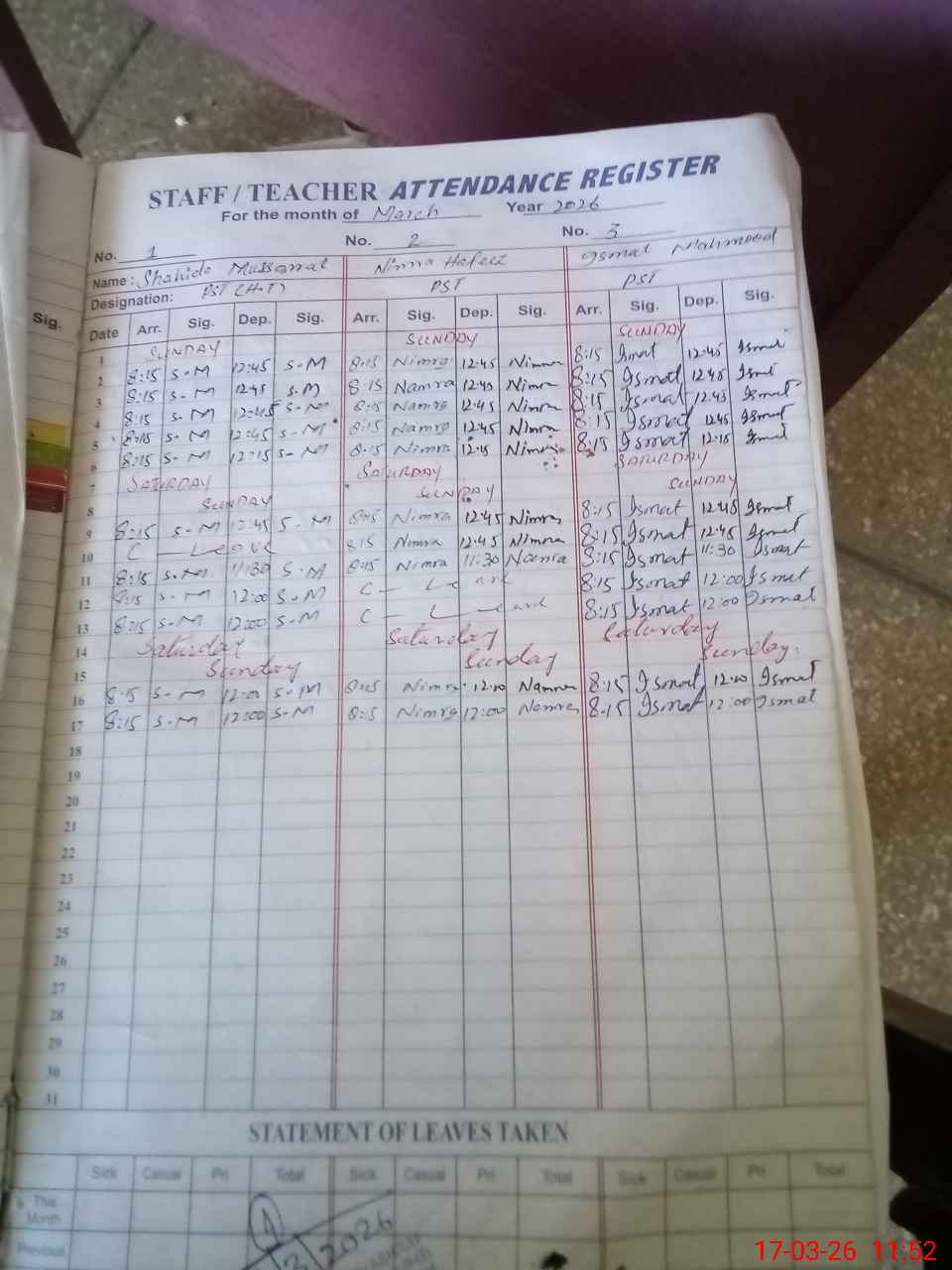 | Leave | Duty | Absent | Maternity | Medical | Ex- Pak |