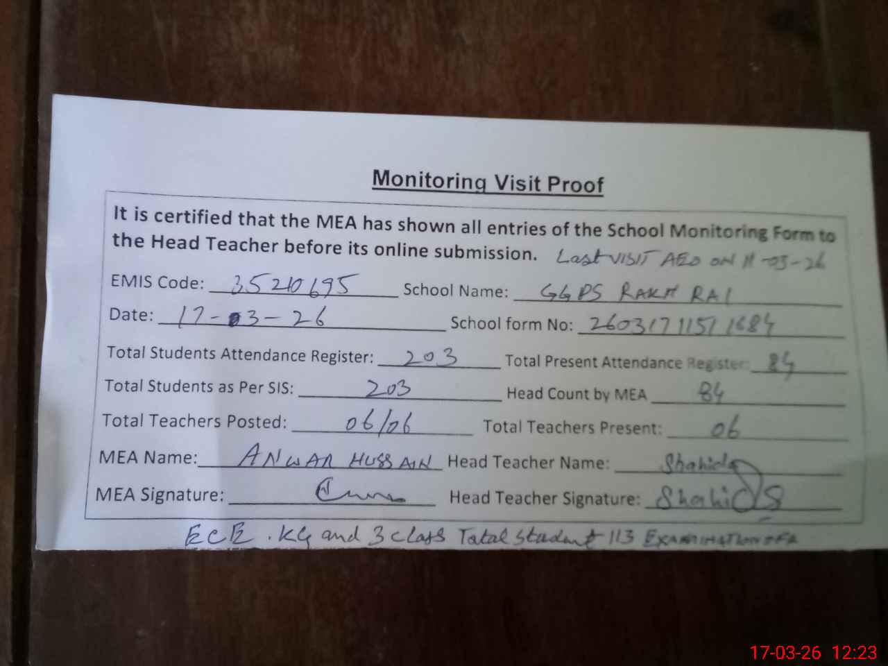 | Attendance Register | Head Teacher | MEA with School | Visit Proof |