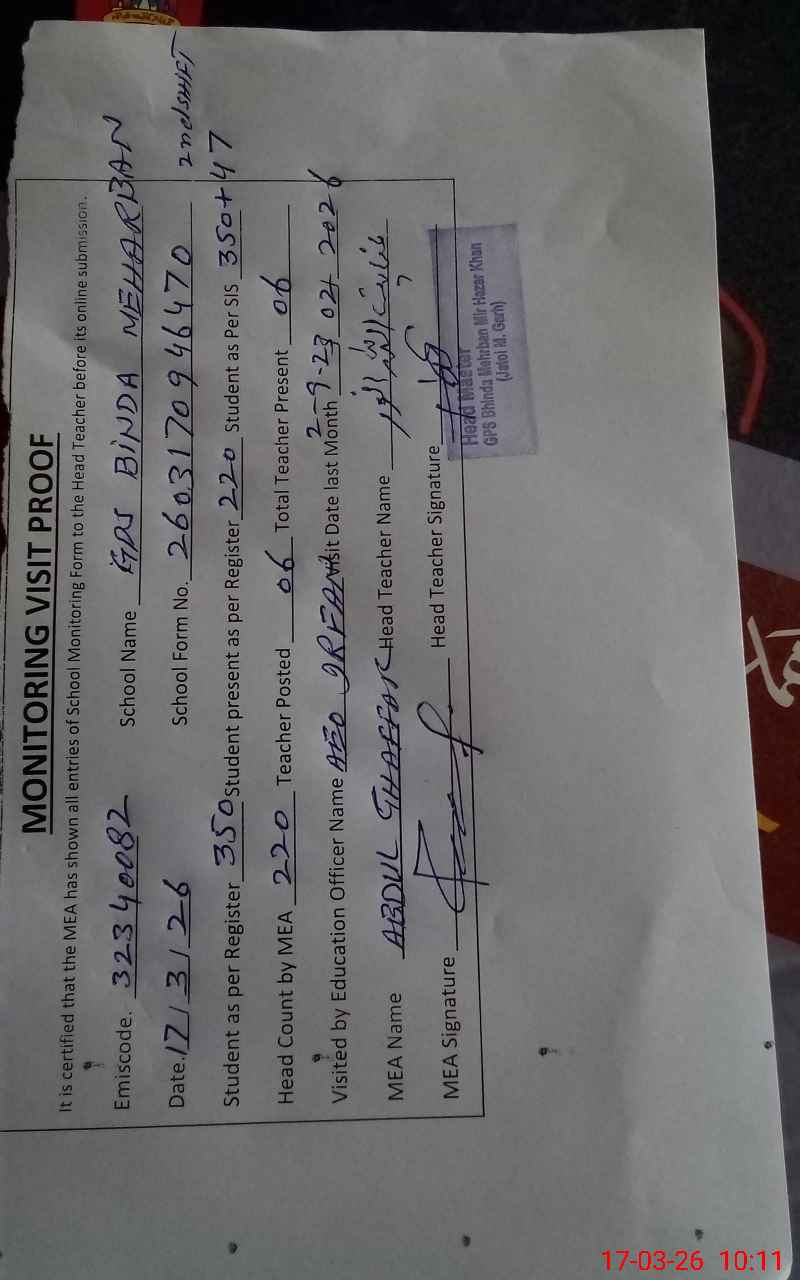 | EMIS Code: 32340082 | Name of School: GPS BINDA MEHARBAN | |||