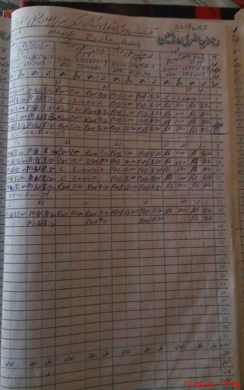 | CNIC | Full Name | Designation | R/C | Absence During Last Calender Month |