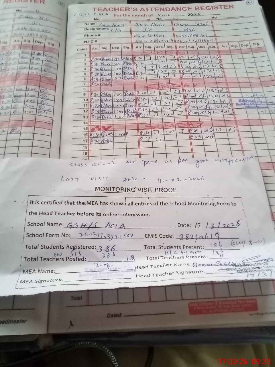 | Remarks (Use Separate Page if Required): last visit AEO 11 Feb 26 Total on register 386 Total on sis 386 eccee1 to class 2 students are spare as per government notification | |||||