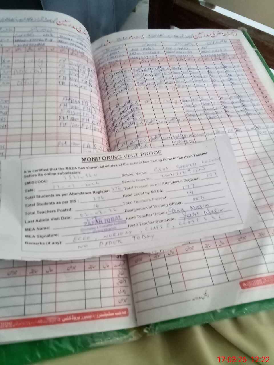 | Remarks (Use Separate Page if Required): last visit AEO 2 Mar 26 Total on register 376 Total on sis 376 ecee nursery one three and five class no paper today | |||||