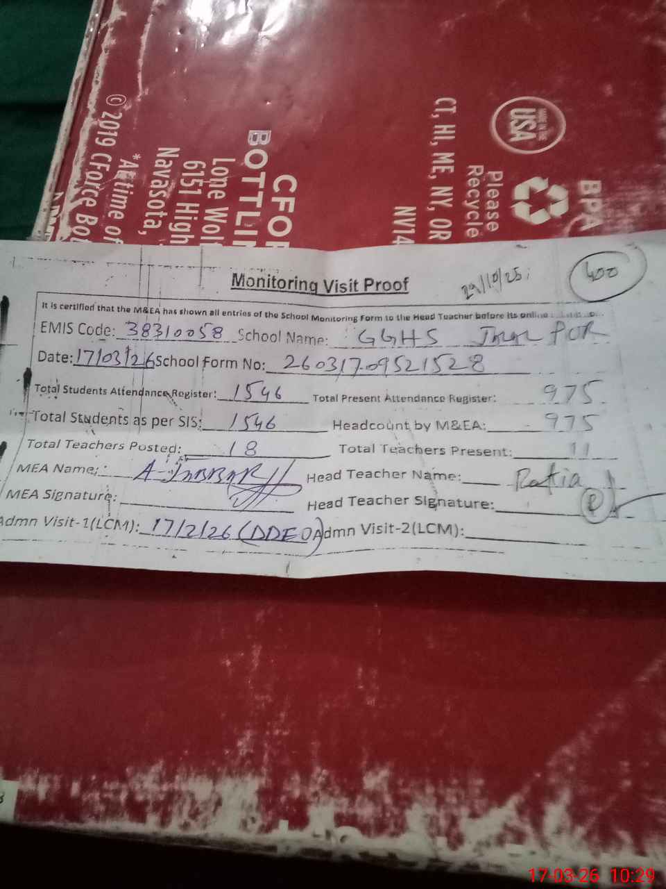 | Attendance Register | Head Teacher | MEA with School | Visit Proof |