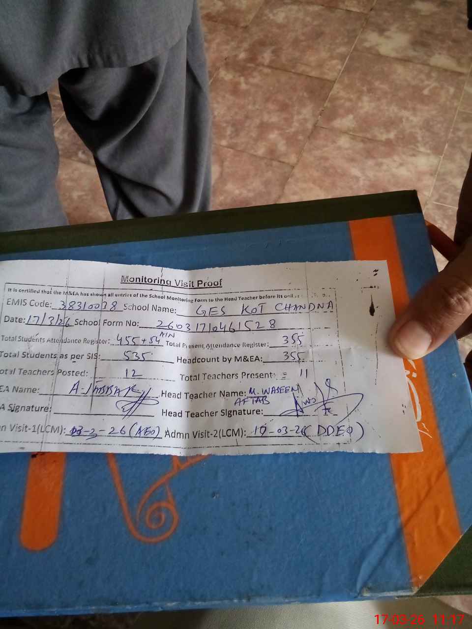 | Attendance Register | Head Teacher | MEA with School | Visit Proof |