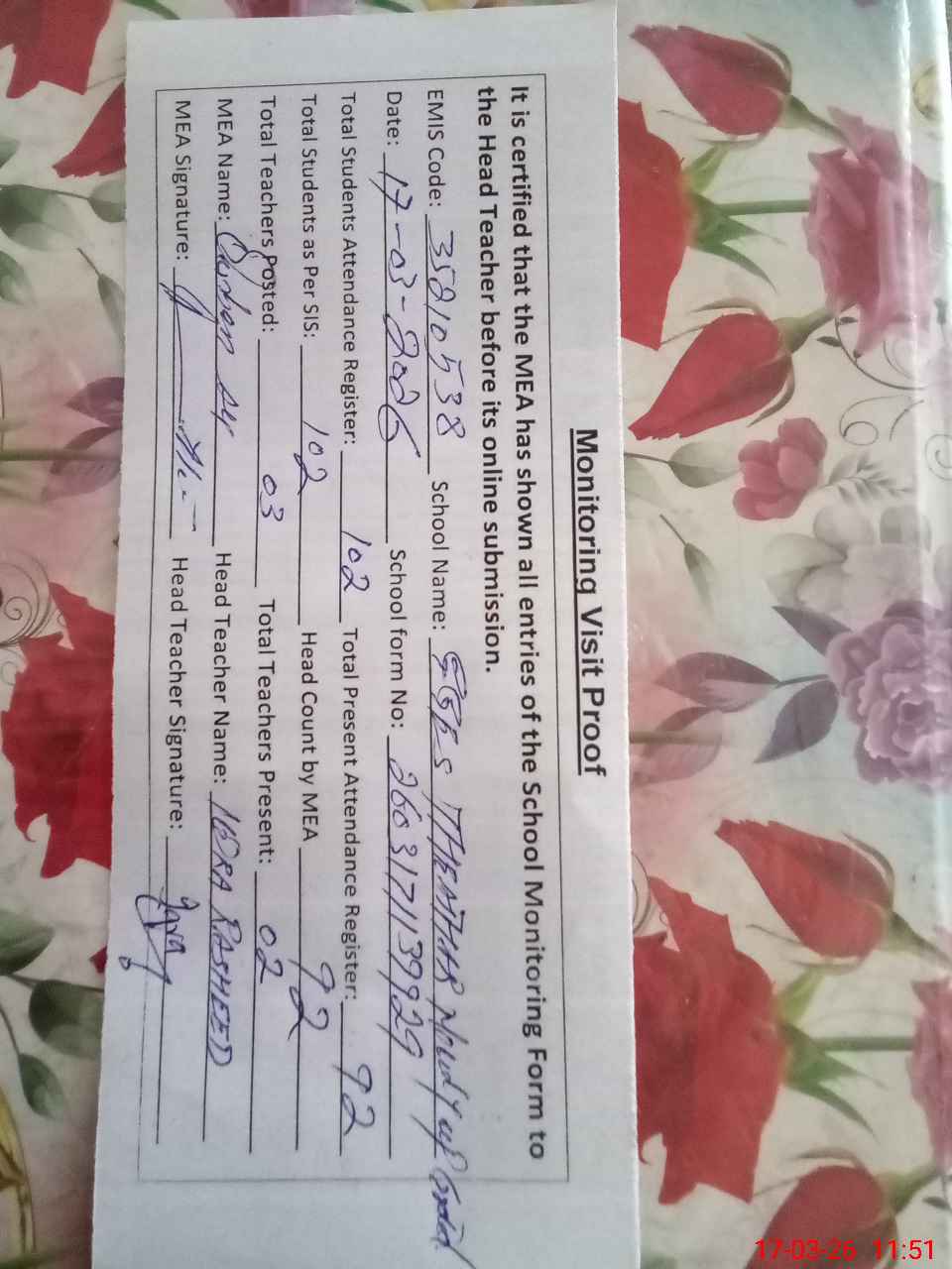 | Remarks (Use Separate Page if Required): Teacher Nageena Amin Pst leave not approved or sanctioned by concerning authority so mark her absent. Administrator visit of the AEO on 12th February 2026 and 19th February 2026. Administrator visit of the Dy DEO in the school from the Long time not available. Needed white wash in the school. | |||||