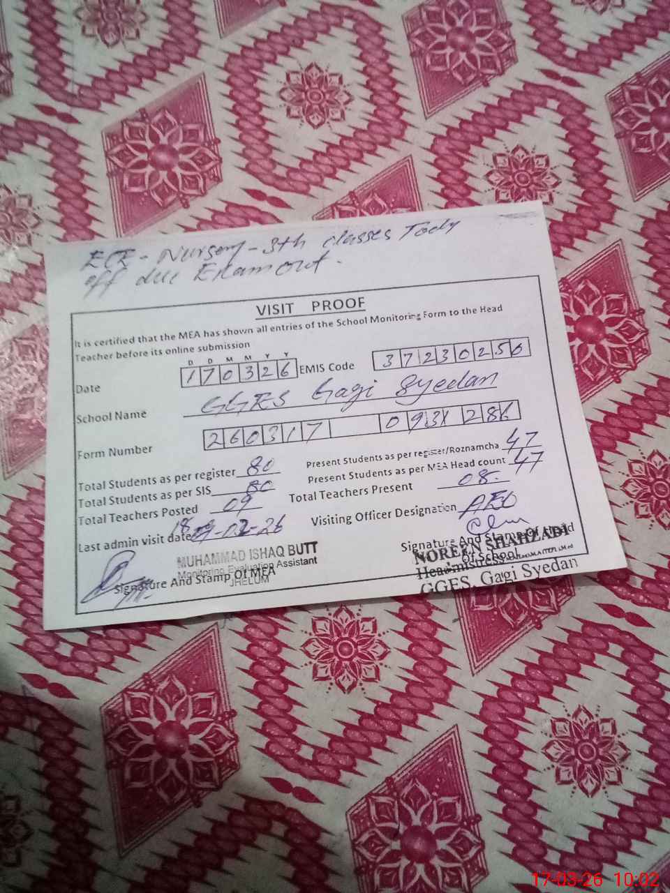 | Certified that this School was Inspected by the Undersigned MEA/DMO Today and the Information Stated Above is as Per Record. | |||||