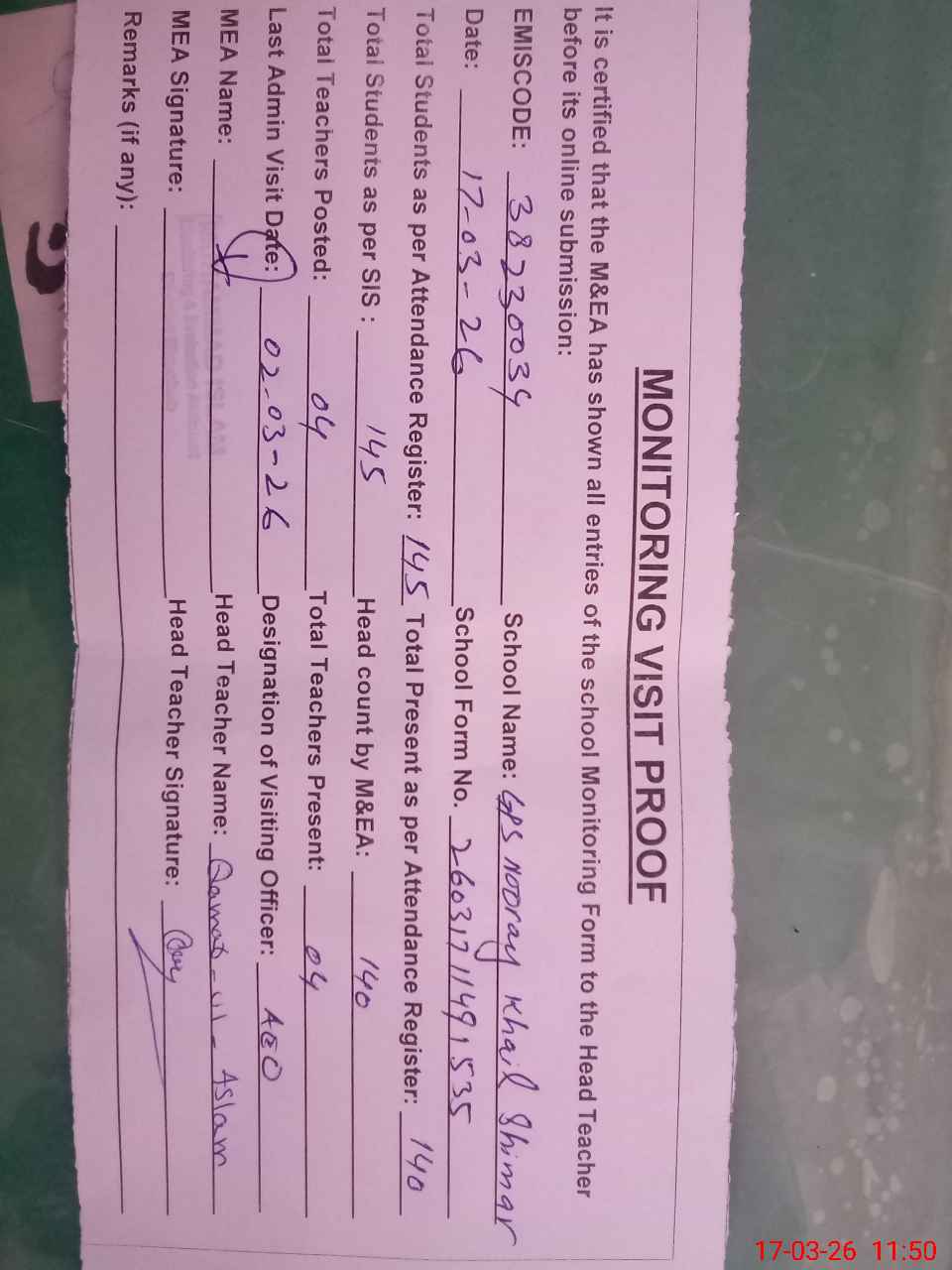 | Remarks (Use Separate Page if Required): AEO visited school on 2 March 2026 students strength on sis 145 3 classes sitting under shade 1 toilet gutter blocked About 150 feet School boundary wall dangerous | |||||