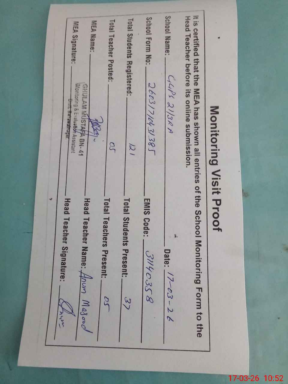 | Attendance Register | Head Teacher | MEA with School | Visit Proof |