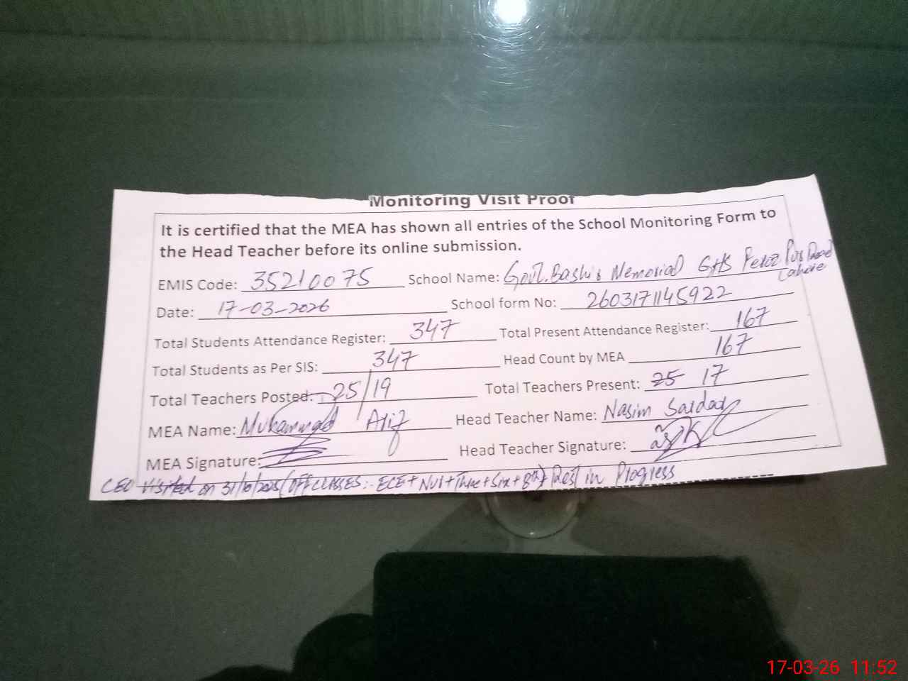 | EMIS Code: 35210075 | Name of School: GGHS BASHIR MEMORIAL FEROZ PUR ROAD | |||