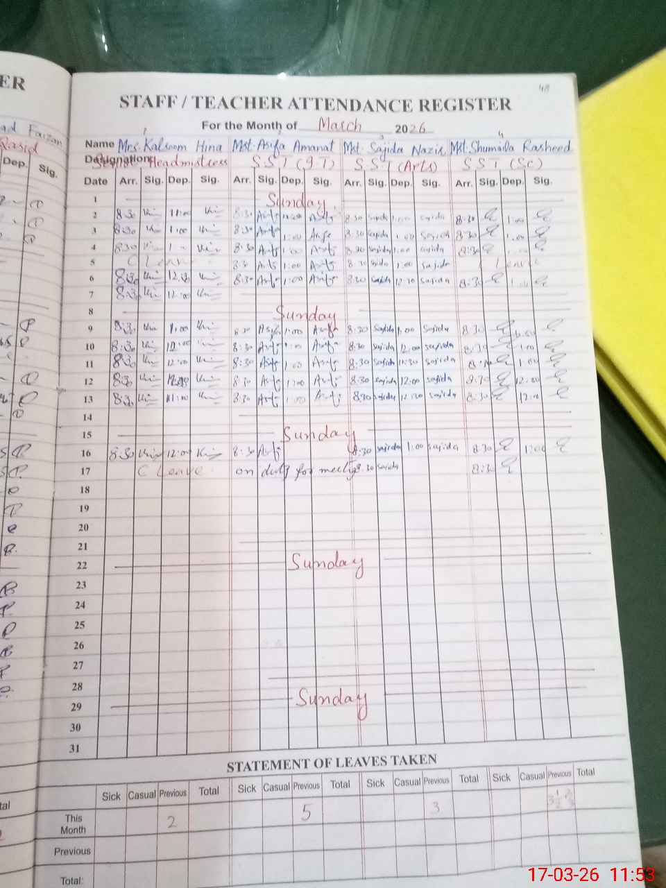 | 32**** | Ka**** Hi**** | Sr. Headmaster (English) | Regular | 0 | 0 | 0 | 0 | 0 | 0 | 0 | 0 | 0 | Absent (Un-Authorized) |