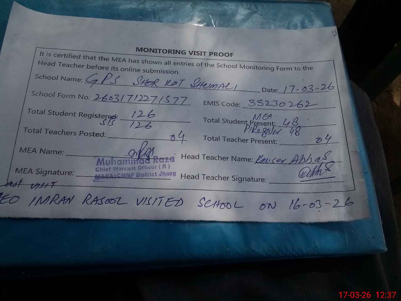 | Attendance Register | Head Teacher | MEA with School | Visit Proof |
