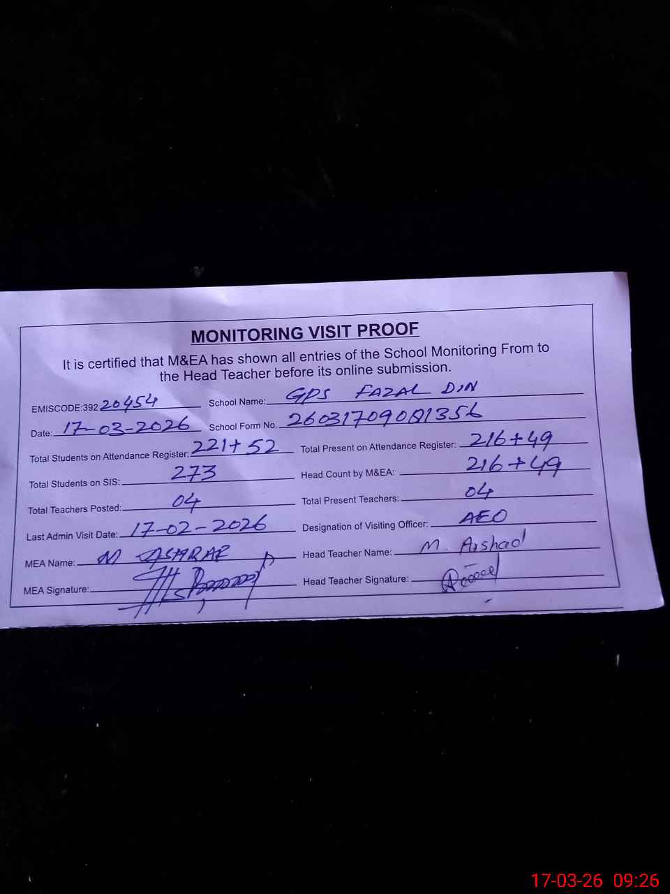 | Attendance Register | Head Teacher | MEA with School | Visit Proof |