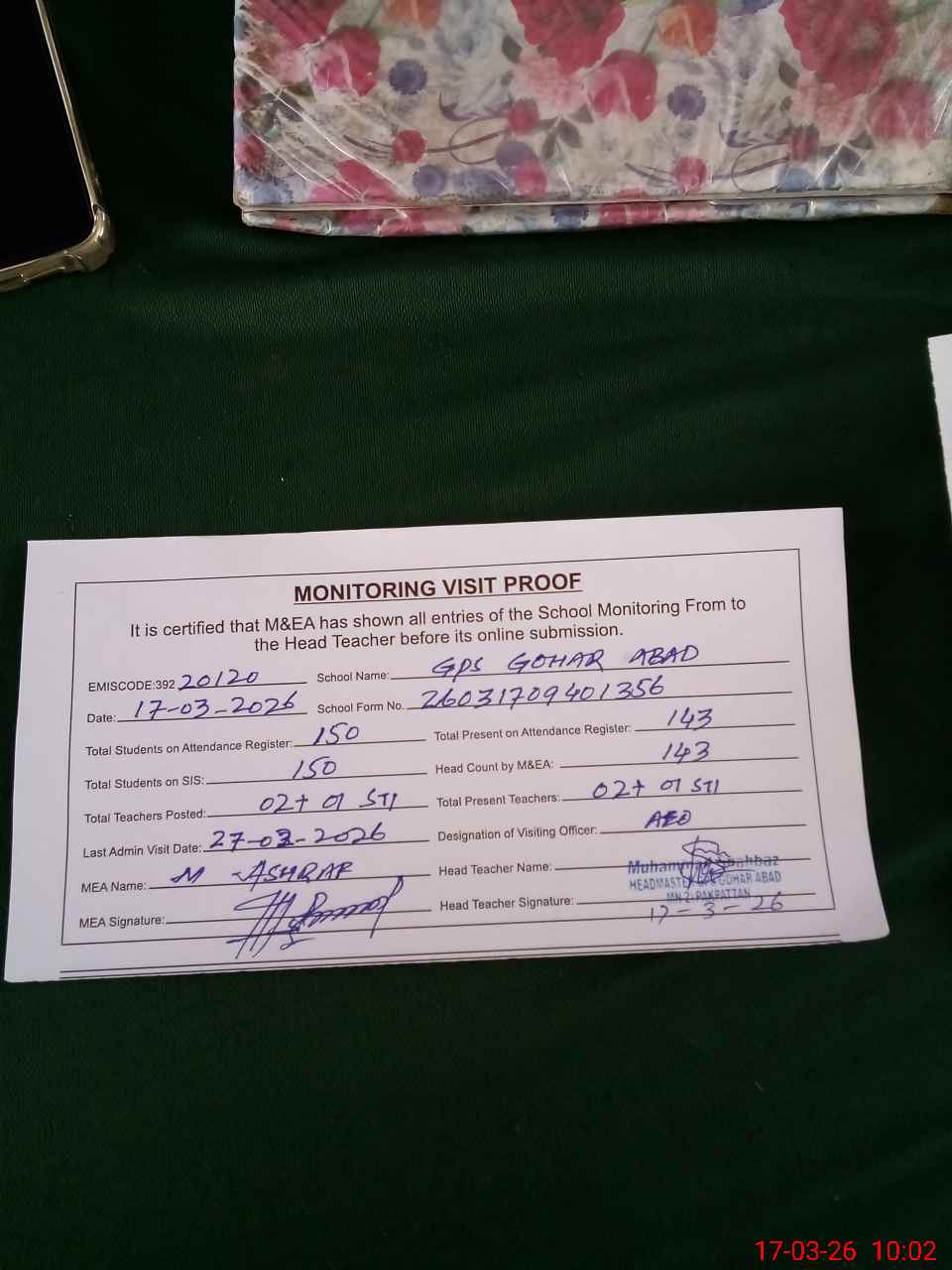 | Attendance Register | Head Teacher | MEA with School | Visit Proof |