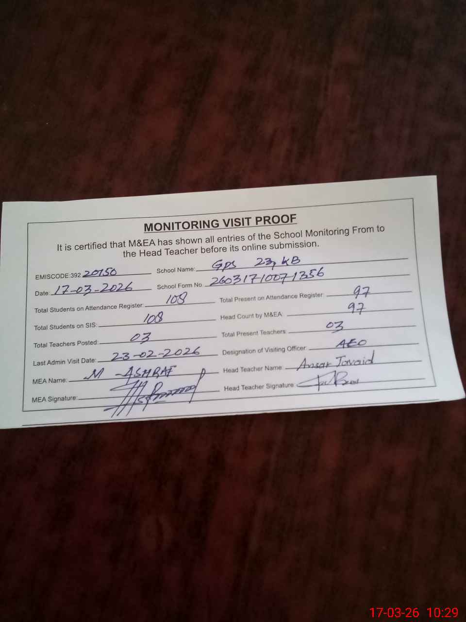 | EMIS Code: 39220150 | Name of School: GPS CHAK NO. 23 KB | |||