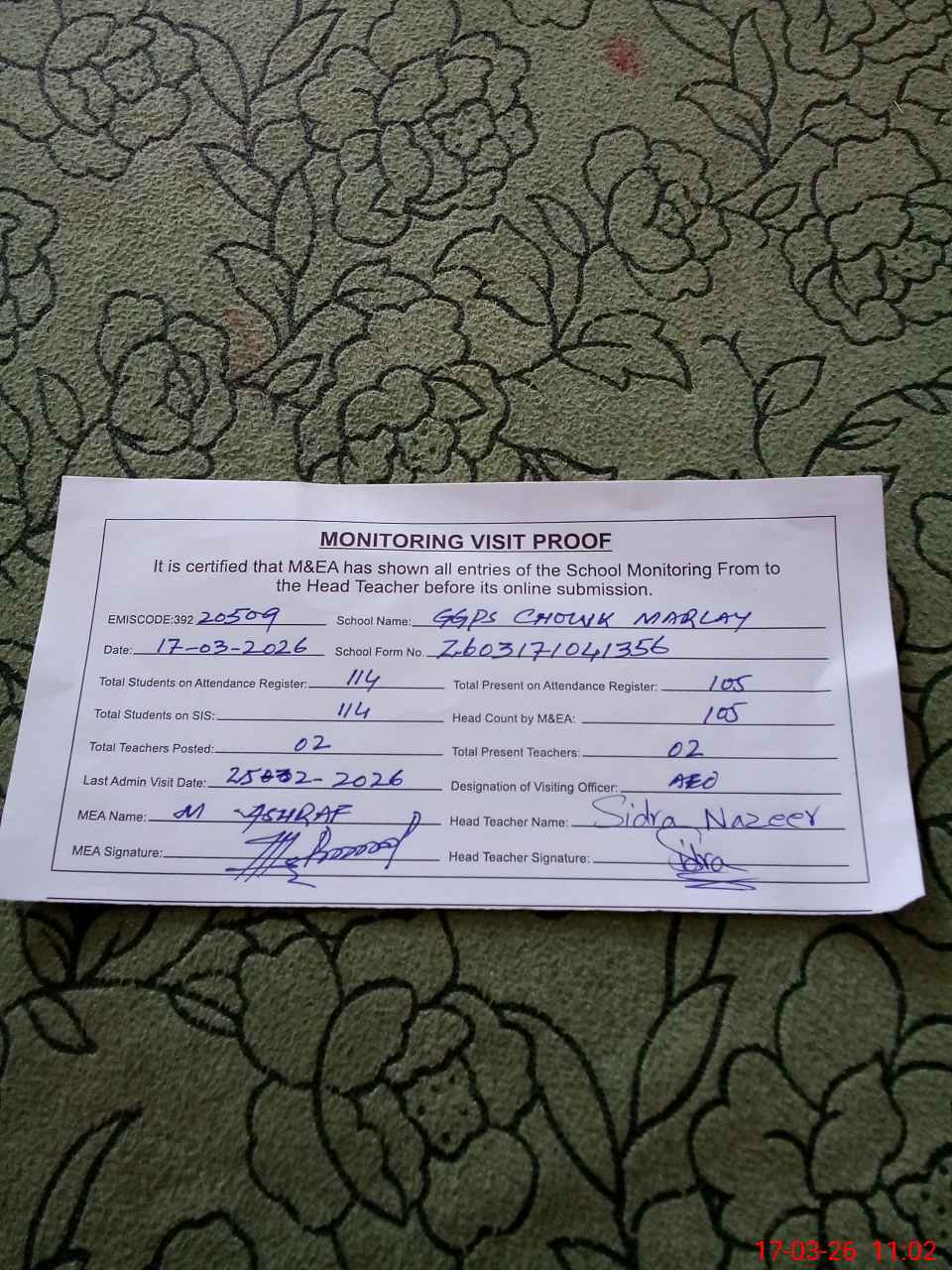 | EMIS Code: 39220509 | Name of School: GGPS CHOWK MARLAY | |||