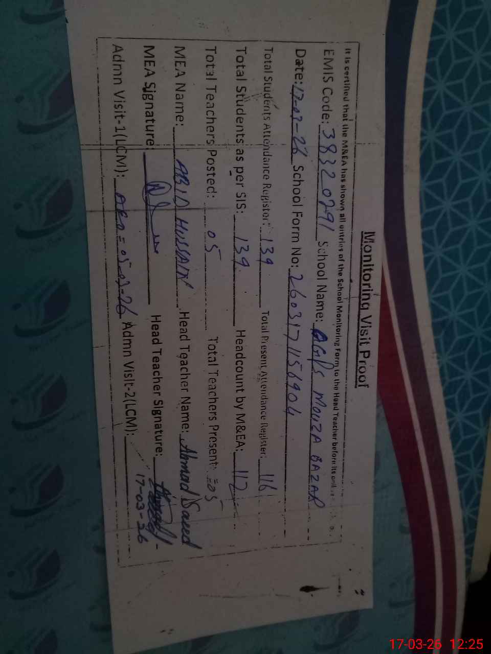 | Attendance Register | Head Teacher | MEA with School | Visit Proof |