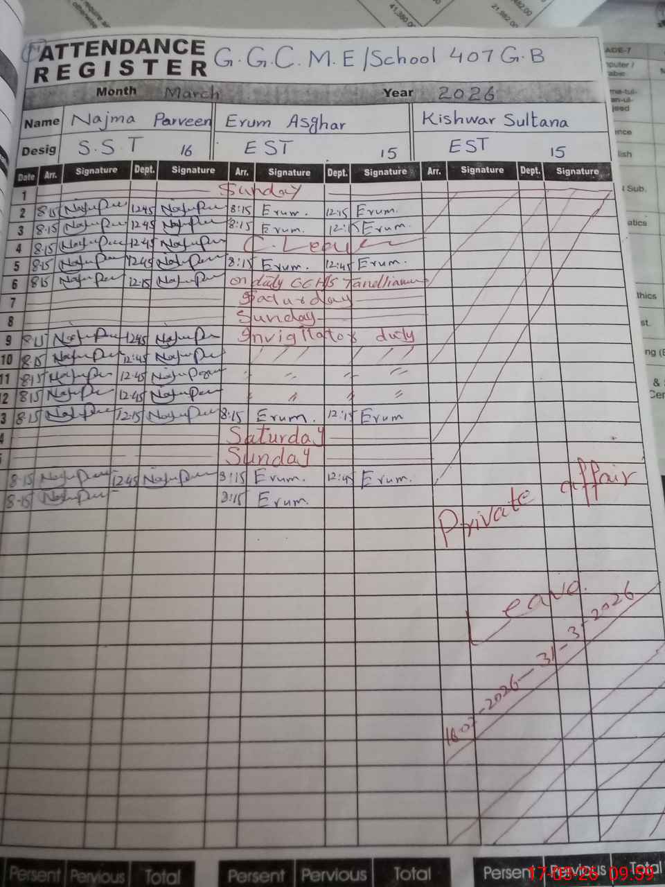 | No. of Students Present - Female | 0 | 0 | 38 | 30 | 0 | 35 | 19 | 0 | 23 | 0 | 145 | |||||