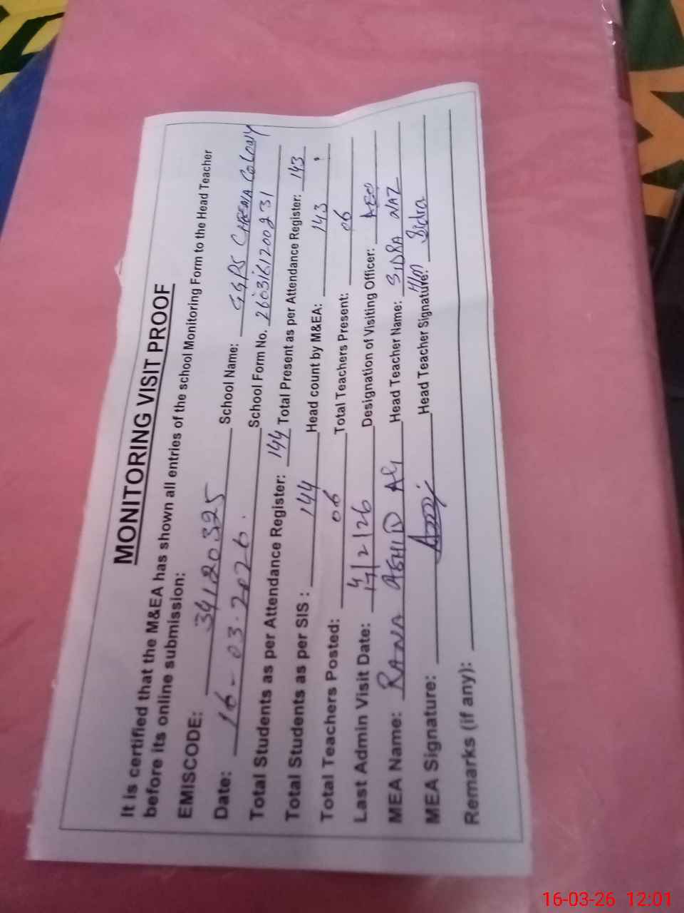 | Attendance Register | Head Teacher | MEA with School | Visit Proof |
