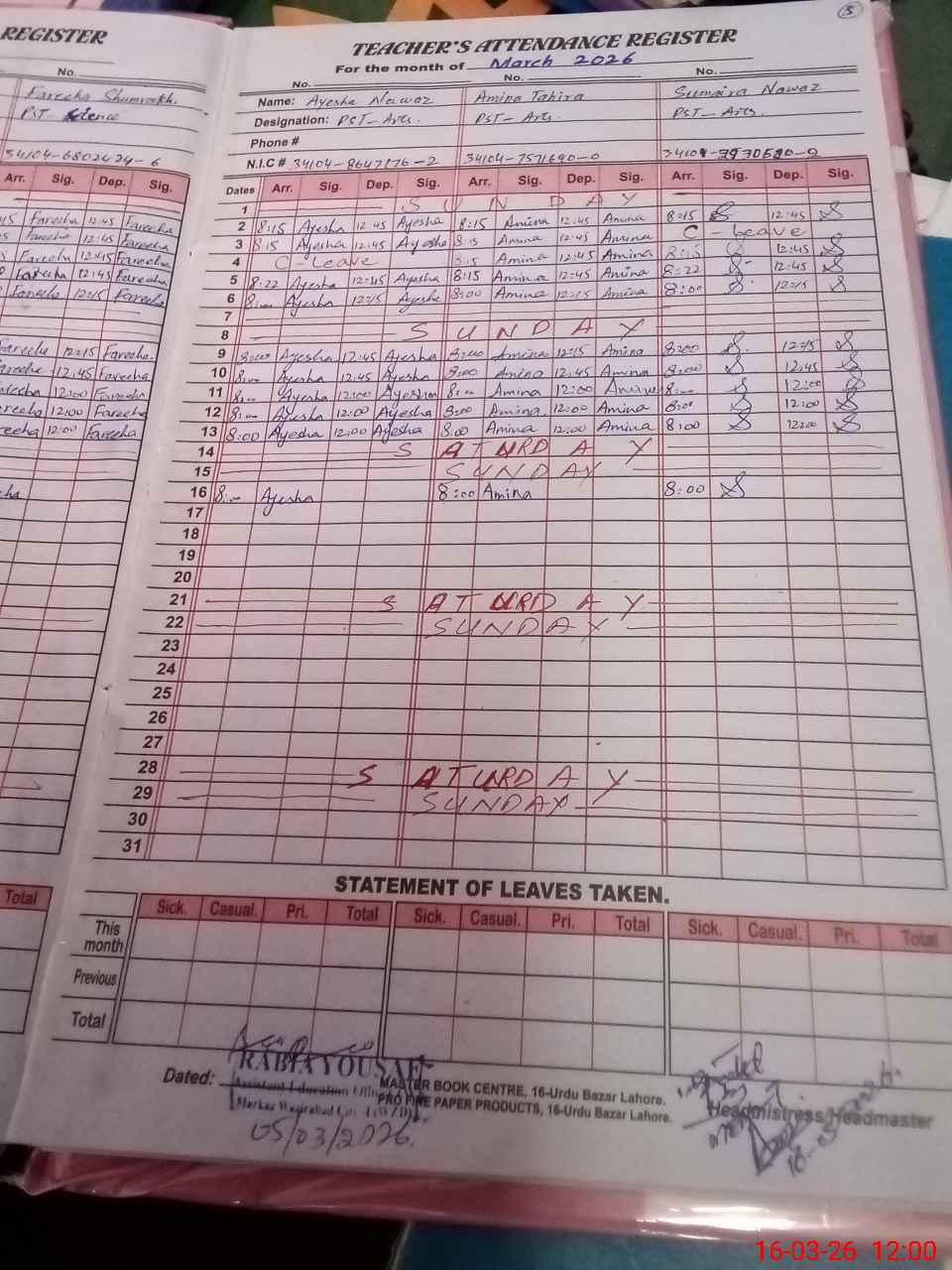 | CNIC | Full Name | Designation | R/C | Absence During Last Calender Month |