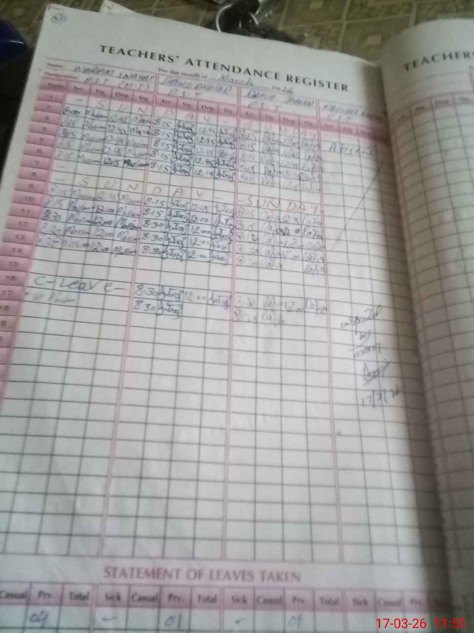 Leave Type | Remarks for today (Leave,Training, Exam,Absent,Late, Other duty) |