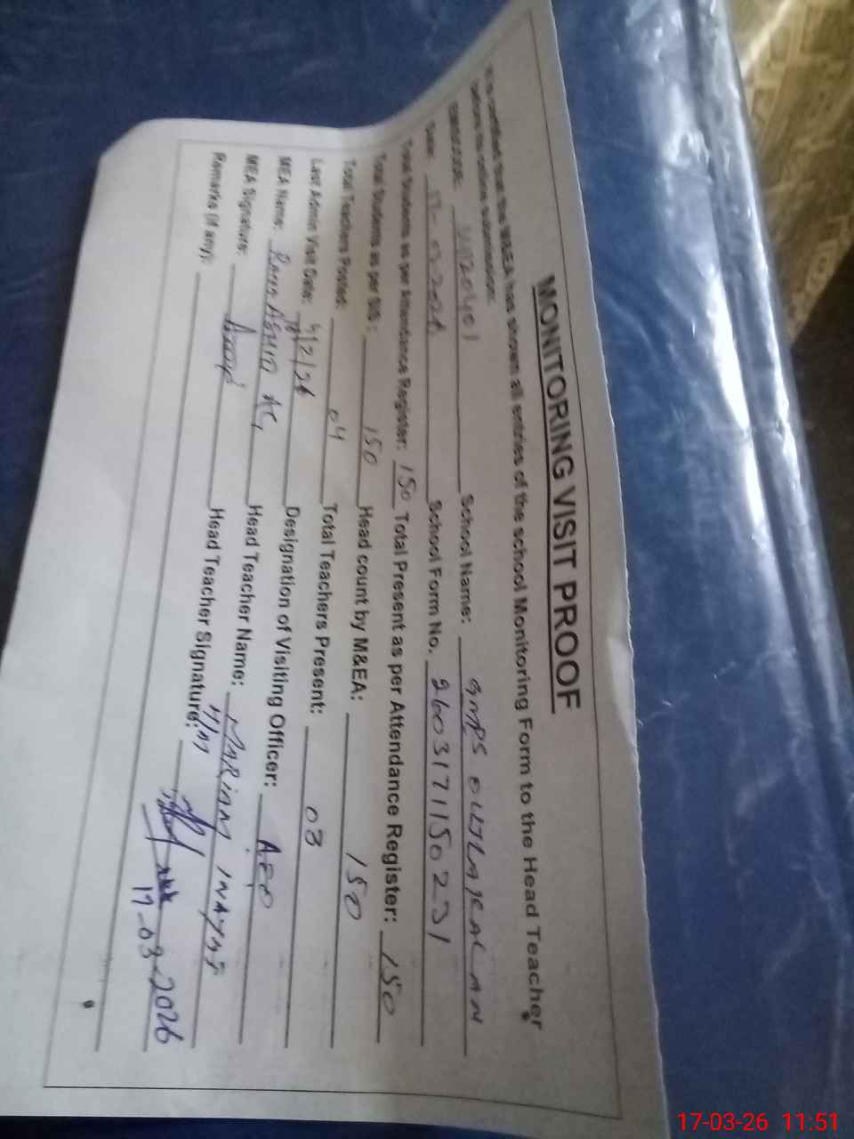 | Attendance Register | Head Teacher | MEA with School | Visit Proof |