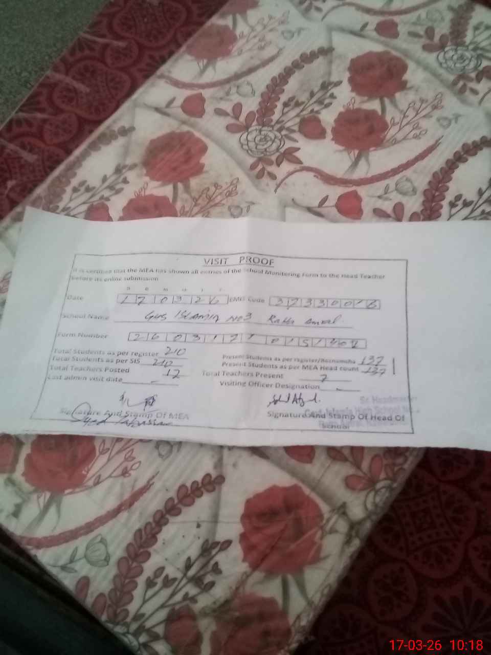 | Attendance Register | Head Teacher | MEA with School | Visit Proof |